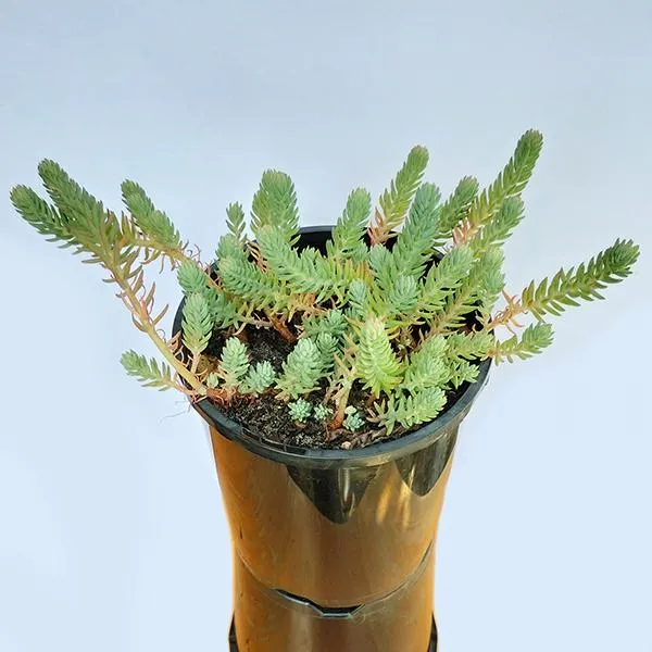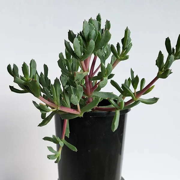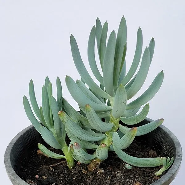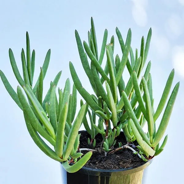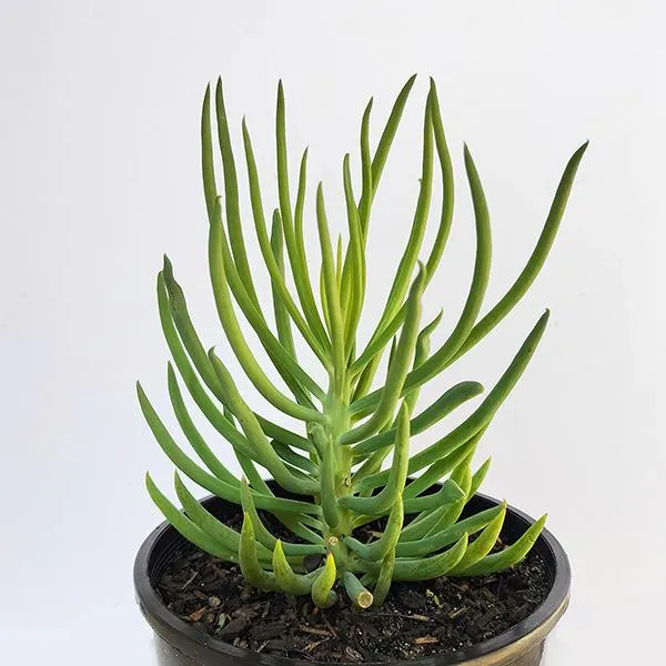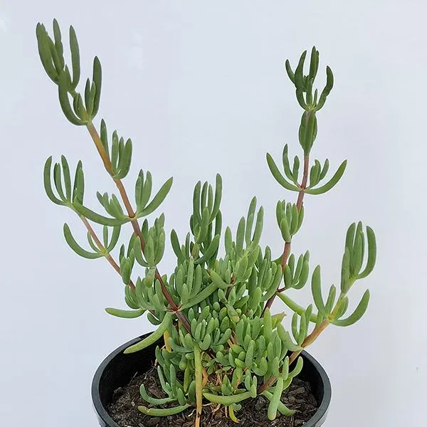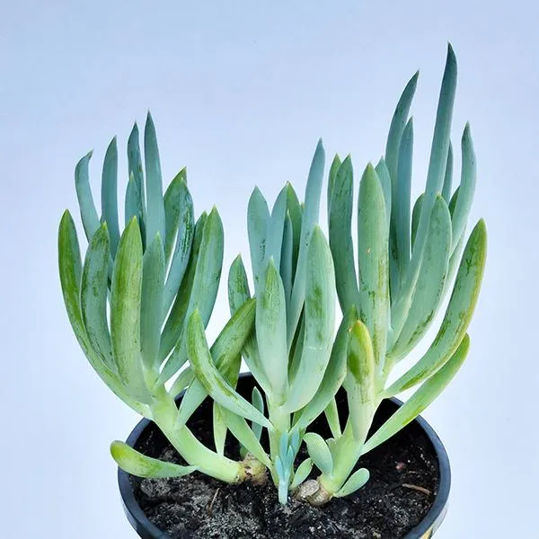 Grown for its larger blue glaucous finger like leaves. It spreads as a ground cover.15cm x 50cm wide or more.
