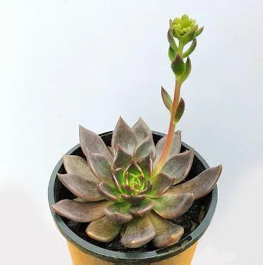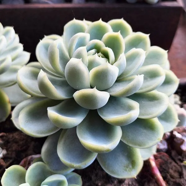 Dark coloured rosette, up to 10cm across. Has dark coral coloured flowers in early winter.